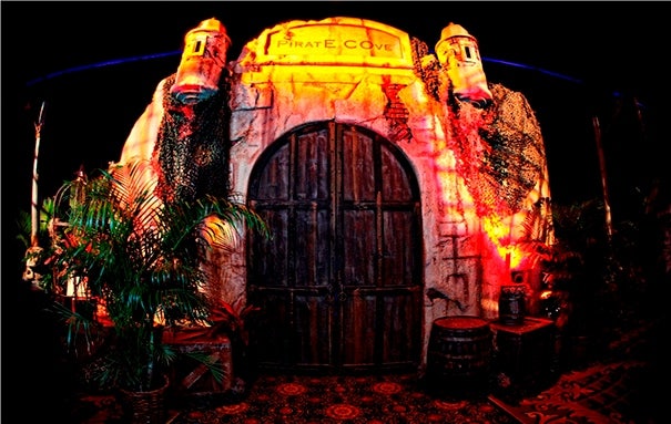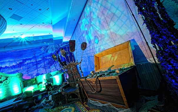 The adventure begins when attendees enter through large rustic doors to discover a beached pirate ship and a rowdy band of pirates. Rum barrels, cannons, and dock pilings are scattered about while at the center of the room, a realistic galleon mast stands tall with its base designed to replicate a ship’s deck.