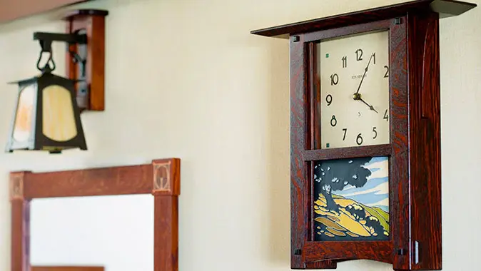 Feel like you're in a cozy cabin with décor like this wooden clock and rustic lamp wall fixture.