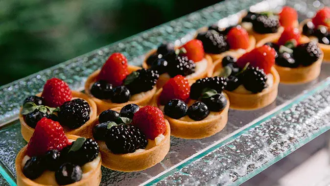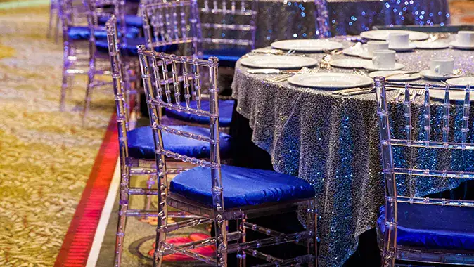A touch of midnight blue stardust accentuates these tables, promising a magical dining experience.