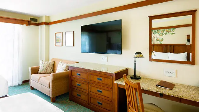 Come back from a long day at the park to a comfortable room complete with a TV and a cozy bed.