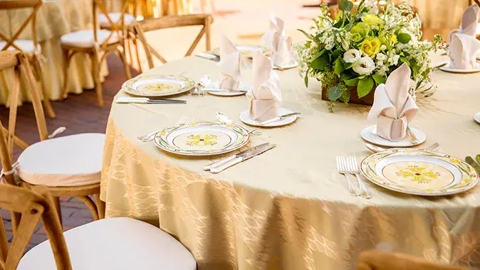 Set in tones of golden cheer, these tables evoke the warmth of the occasion.